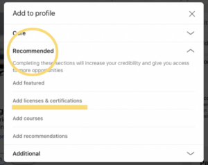 Select Add profile section directly under your cover photo, then Recommended, then Licenses & certificates.